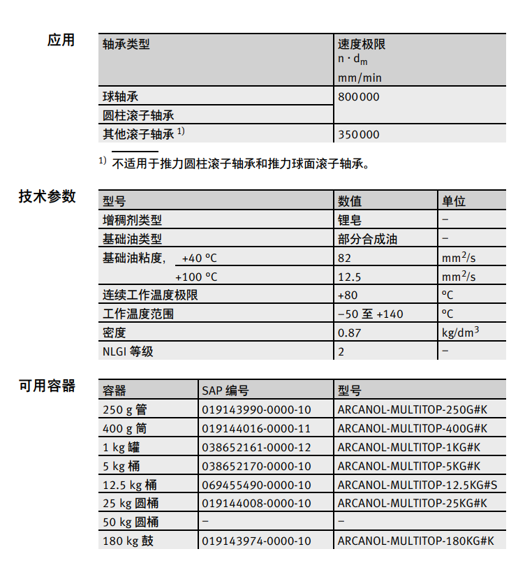 Arcanol MULTITOP 滚动轴承润滑脂是一种通用润滑脂,适用于温度范围较宽的要求苛刻的应用。