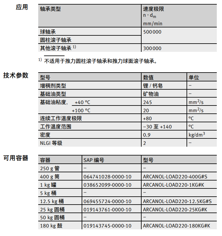Arcanol LOAD220 是一种应用于轧钢厂、造纸机械和轨道车辆的 重型润滑脂。它在高载荷和低速下具有绝佳的性能,由于其高效 的 EP 添加剂,可以在冲击载荷下为轴承布置提供安全保障, 并为轴承密封布置提供充分的支撑,同时具有良好的耐水性和 腐蚀防护功能。